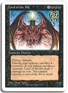 Flying, Trample. During your upkeep, sacrifice a creature. If you cannot sacrifice a creature, Lord of the Pit deals 7 damage to you. You cannot sacrifice Lord of the Pit to itself.