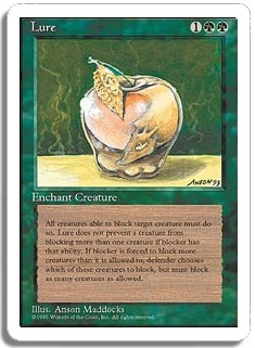 All creatures able to block target creature must do so. Lure does not prevent a creature from blocking more than one creature if blocker has that ability. If blocker is forced to block more creatures than it is allowed to, defender chooses which of these creatures to block, but must block as many creatures as allowed.