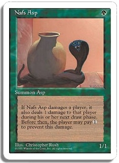 If Nafs Asp damages a player, it also deals 1 damage to that player during his or her next draw phase. Before then, the player may pay <1> to prevent this damage.