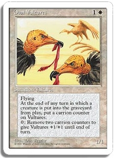 Flying. At the end of any turn in which a creature is put into the graveyard from play, put a carrion counter on Vultures. <0>: Remove two carrion counters to give Vultures +1/+1 until end of turn.