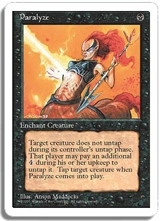 Target creature does not untap during its controller's untap phase. That player may pay an additional <4> during his or her upkeep to untap it. Tap target creature when Paralyze comes into play.