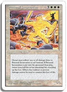 Owner may redirect any or all damage done to Personal Incarnation to self instead. If Personal Incarnation is put into the graveyard from play, owner loses half his or her remaining life, rounding up the loss. Effects that redirect or prevent damage cannot be used to counter this loss of life.