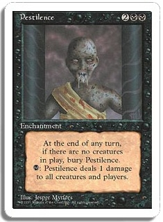At the end of any turn, if there are no creatures in play, bury Pestilence. <B>: Pestilence deals 1 damage to all creatures and players.