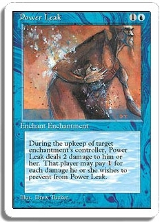 During the upkeep of target enchantment's controller, Power Leak deals 2 damage to him or her. That player may pay <1> for each damage he or she wishes to prevent from Power Leak.