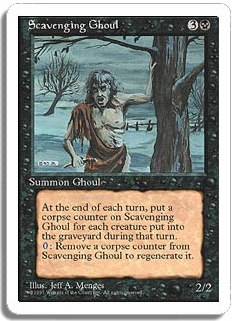 At the end of each turn, put a corpse counter on Scavenging Ghoul for each creature put into the graveyard during that turn. <0>: Remove a corpse counter from Scavenging Ghoul to regenerate it.