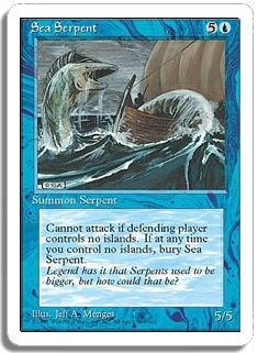 Cannot attack if defending player controls no islands. If at any time you control no islands, bury Sea Serpent.