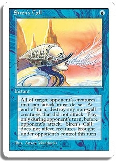 All of target opponent's creatures that can attack must do so. At end of turn, destroy any non-wall creatures that did not attack. Play only during opponent's turn, before opponent's attack. Siren's Call does not affect creatures brought under opponent's control this turn.