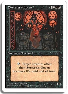 <T>: Target creature other than Sorceress Queen becomes 0/2 until end of turn.