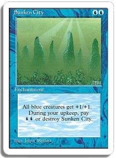 All blue creatures get +1/+1. During your upkeep, pay <UU> or destroy Sunken City.