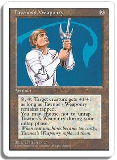 <2,T>: Target creature gets +1/+1 as long as Tawnos's Weaponry remains tapped. You may choose not to untap Tawnos's Weaponry during your untap phase.