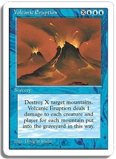 Destroy X target mountains. Volcanic Eruption deals 1 damage to each creature and player for each mountain put into the graveyard in this way.