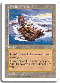<T>: Add one colorless mana to your mana pool. <T>: Add <W> or <U> to your mana pool. Adarkar Wastes deals 1 damage to you.