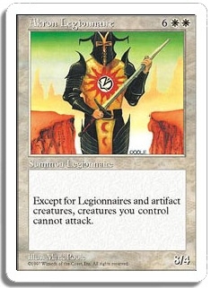 Except for Legionnaires and artifact creatures, creatures you control cannot attack.