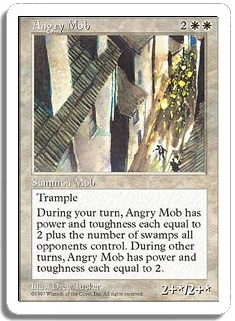 Trample. During your turn, Angry Mob has power and toughness each equal to 2 plus the number of swamps all opponents control. During other turns, Angry Mob has power and toughness each equal to 2.