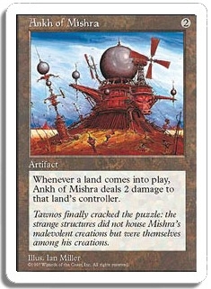 Whenever a land comes into play, Ankh of Mishra deals 2 damage to that land's controller.