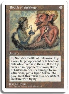 <1,Sacrifice Bottle of Suleiman>: Flip a coin; target opponent calls heads or tails while coin is in the air. If the flip ends up in opponent's favor, Bottle of Suleiman deals 5 damage to you. Otherwise, put a Djinn token into play. Treat this token as a 5/5 artifact creature with flying.
