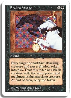 Bury target nonartifact attacking creature and put a Shadow token into play. Treat this token as a black creature with the same power and toughness as that attacking creature. At end of turn, bury the token.