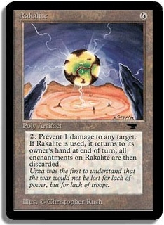 <2>: Prevent 1 damage to any target. If Rakalite is used, it returns to its owner's hand at end of turn; all enchantments on Rakalite are then discarded.
