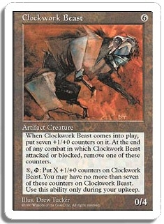 When Clockwork Beast comes into play, put seven +1/+0 counters on it. At the end of any combat in which Clockwork Beast attacked or blocked, remove one of these counters. <X,T>: Put X +1/+0 counters on Clockwork Beast. You may have no more than seven of these counters on Clockwork Beast. Use this ability only during your upkeep.