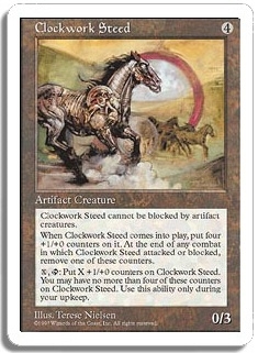 Clockwork Steed cannot be blocked by artifact creatures. When Clockwork Steed comes into play, put four +1/+0 counters on it. At the end of any combat in which Clockwork Steed attacked or blocked, remove one of these counters. <X,T>: Put X +1/+0 counters on Clockwork Steed. You may have no more than four of these counters on Clockwork Steed. Use this ability only during your upkeep.