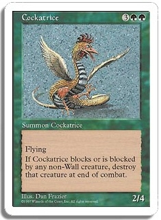 Flying. If Cockatrice blocks or is blocked by any non-Wall creature, destroy that creature at end of combat.