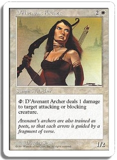 <T>: D'Avenant Archer deals 1 damage to target attacking or blocking creature.