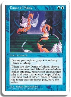 During your upkeep, pay <UU> or bury Dance of Many. When you play Dance of Many, choose target summon card. When Dance of Many comes into play, put a token creature into play and treat it as an exact copy of that summon card. If either Dance of Many or the token creature leaves play, bury the other.