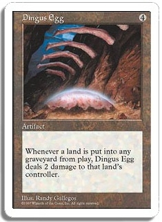 Whenever a land is put into any graveyard from play, Dingus Egg deals 2 damage to that land's controller.