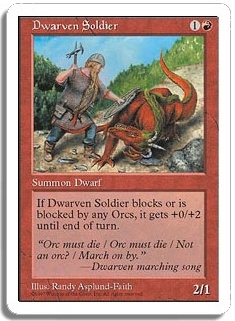 If Dwarven Soldier blocks or is blocked by any Orcs, it gets +0/+2 until end of turn.