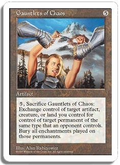 <5,Sacrifice Gauntlets of Chaos>: Exchange control of target artifact, creature, or land you control for control of target permanent of the same type that an opponent controls. Bury all enchantments played on those permanents.