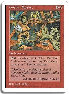 <2R,Sacrifice two Goblins>: Put three Goblin tokens into play. Treat these tokens as 1/1 red creatures.