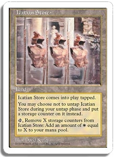 Icatian Store comes into play tapped. You may choose not to untap Icatian Store during your untap phase and put a storage counter on it instead. <T,Remove X storage counters from Icatian Store>: Add an amount of <W> equal to X to your mana pool.