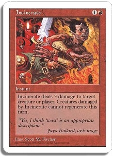 Incinerate deals 3 damage to target creature or player. Creatures damaged by Incinerate cannot regenerate this turn.