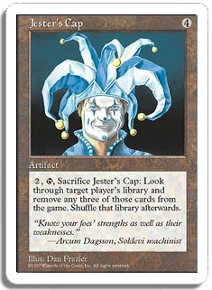 <2,T,Sacrifice Jester's Cap>: Look through target player's library and remove any three of those cards from the game. Shuffle that library afterwards.