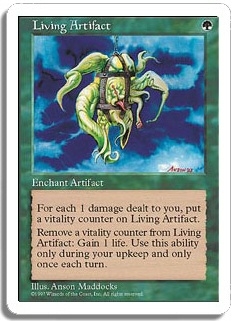 For each 1 damage dealt to you, put a vitality counter on Living Artifact. <Remove a vitality counter from Living Artifact>: Gain 1 life. Use this ability only during your upkeep and only once each turn.