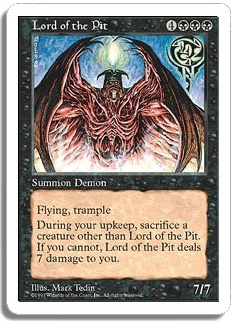 Flying, Trample. During your upkeep, sacrifice a creature other than Lord of the Pit. If you cannot, Lord of the Pit deals 7 damage to you.