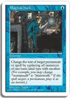 Change the text of target permanent or spell by replacing all instances of one basic land type with another. (For example, you may change 'swampwalk' to 'plainswalk.' If this spell targets a permanent, play it as an instant.)