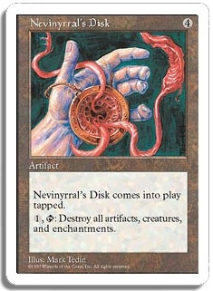 Nevinyrral's Disk comes into play tapped. <1,T>: Destroy all artifacts, creatures, and enchantments.