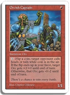 <1>: Flip a coin; target opponent calls heads or tails while coin is in the air. If the flip ends up in your favor, target Orc gets +2/+0 until end of turn. Otherwise, that Orc gets -0/-2 until end of turn.