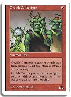 Orcish Conscripts cannot attack this turn unless at least two other creatures are attacking. Orcish Conscripts cannot be assigned to block this turn unless at least two other creatures are blocking.