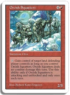 <0>: Gain control of target land defending player controls as long as you control Orcish Squatters. Orcish Squatters deals no combat damage this turn. Use this ability only if Orcish Squatters is attacking and unblocked and only once each turn.