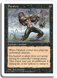 When Paralyze comes into play, tap enchanted creature. Enchanted creature does not untap during its controller's untap phase. That player may pay an additional <4> during his or her upkeep to untap it.