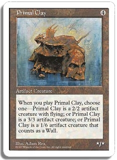 When you play Primal Clay, choose one-Primal Clay is a 2/2 artifact creature with flying; or Primal Clay is a 3/3 artifact creature; or Primal Clay is a 1/6 artifact creature that counts as a Wall.