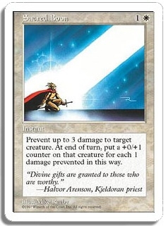 Prevent up to 3 damage to target creature. At end of turn, put a +0/+1 counter on that creature for each 1 damage prevented in this way.