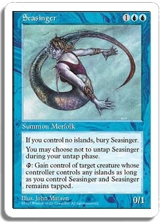 If you control no islands, bury Seasinger. You may choose not to untap Seasinger during your untap phase. <T>: Gain control of target creature whose controller controls any islands as long as you control Seasinger and Seasinger remains tapped.