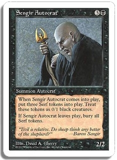 When Sengir Autocrat comes into play, put three Serf tokens into play. Treat these tokens as 0/1 black creatures. If Sengir Autocrat leaves play, bury all Serf tokens.