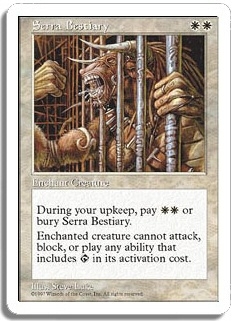 During your upkeep, pay <WW> or bury Serra Bestiary. Enchanted creature cannot attack, block, or play any ability that includes <T> in its activation cost.