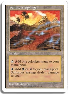 <T>: Add one colorless mana to your mana pool. <T>: Add <B> or <R> to your mana pool. Sulfurous Springs deals 1 damage to you.