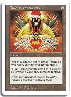 You may choose not to untap Tawnos's Weaponry during your untap phase. <2,T>: Target creature gets +1/+1 as long as Tawnos's Weaponry remains tapped.