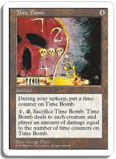 During your upkeep, put a time counter on Time Bomb. <1,T,Sacrifice Time Bomb>: Time Bomb deals to each creature and player an amount of damage equal to the number of time counters on Time Bomb.